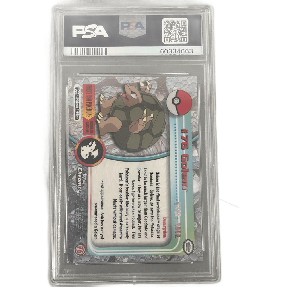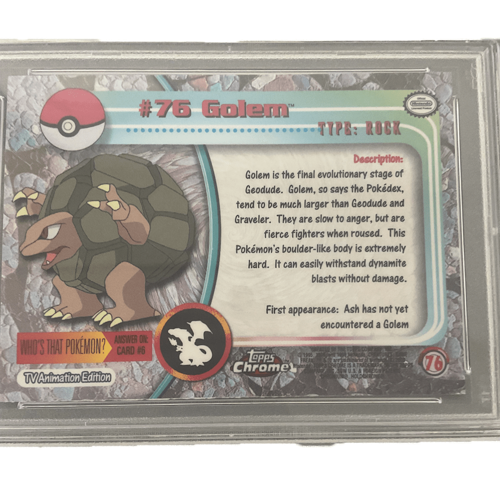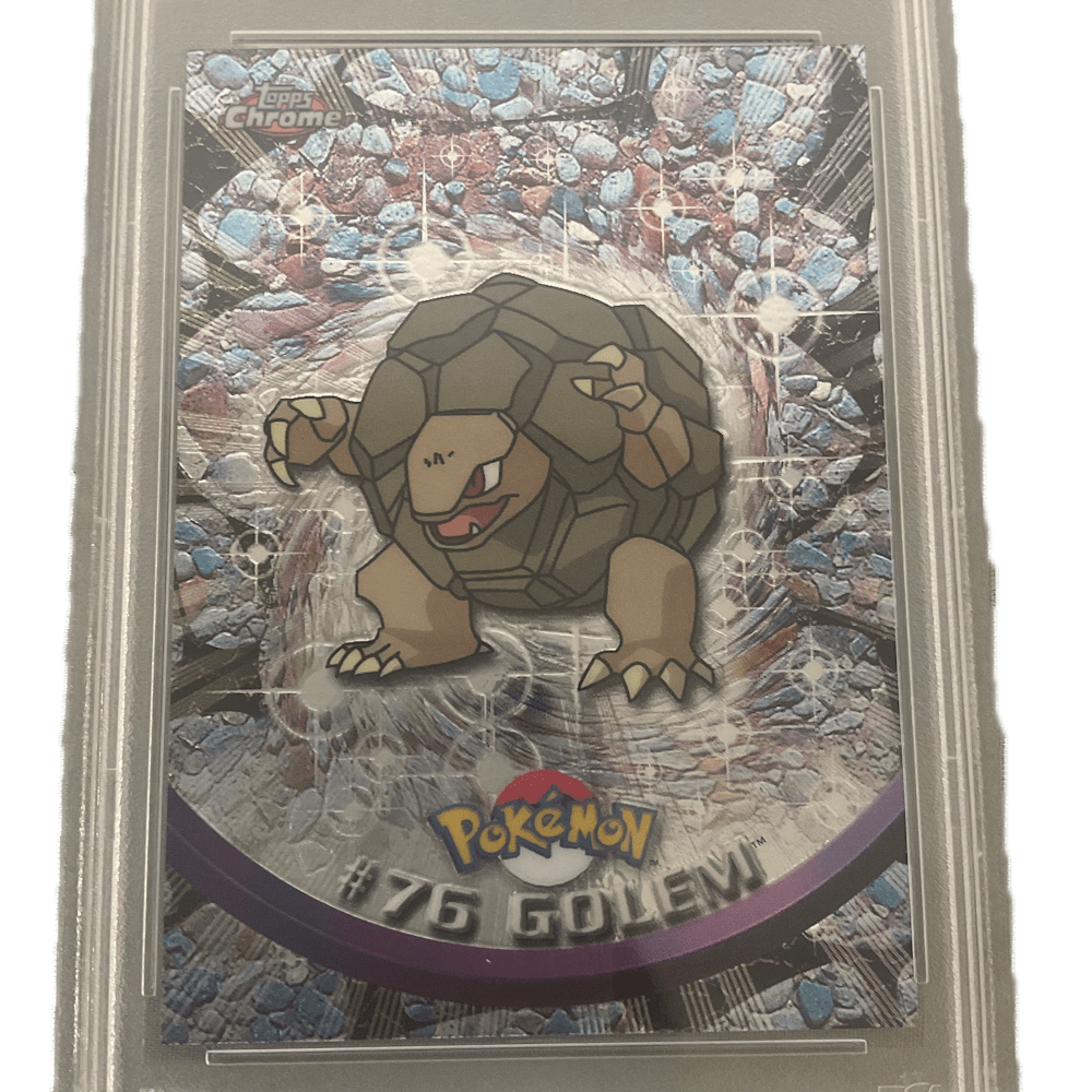 The 2000 Topps Chrome Series 1 Golem (#76) is a vintage English Pokémon collectible card featuring a Holofoil (Spectra or Sparkle) finish, illustrated by Ken Sugimori. Released in 2000, this rare card is part of the first Topps Chrome set featuring the first 78 Pokémon.