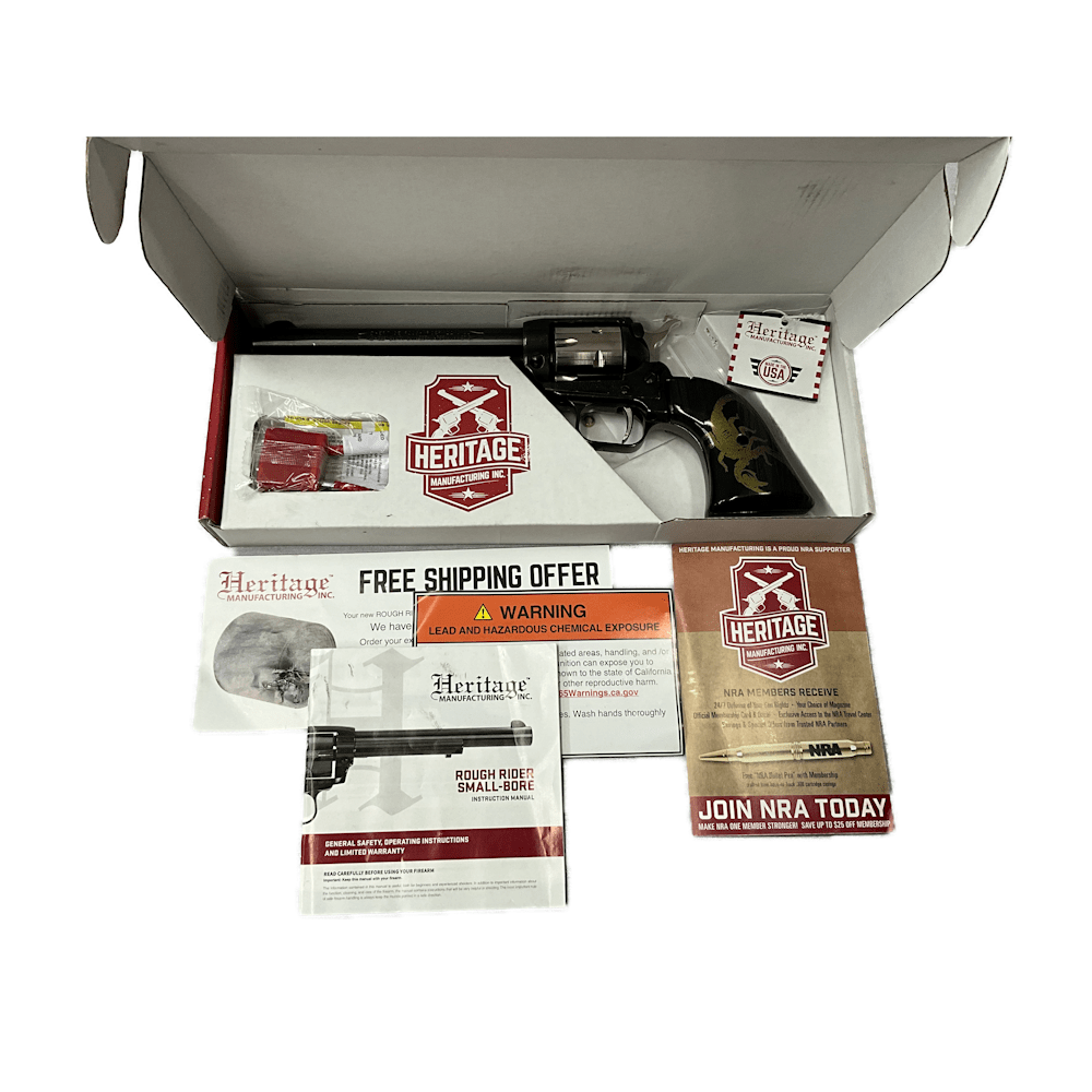 The Heritage Rough Rider 6.5in .22LR revolver is a single-action, 6-shot, Rimfire revolver with a 6.5-inch barrel, fixed sights (or optional adjustable), and a manual thumb safety. It typically features a blued finish, a 1:14″ twist rate, and a weight of roughly 32-34 oz, with an overall length of about 11.78 inches.