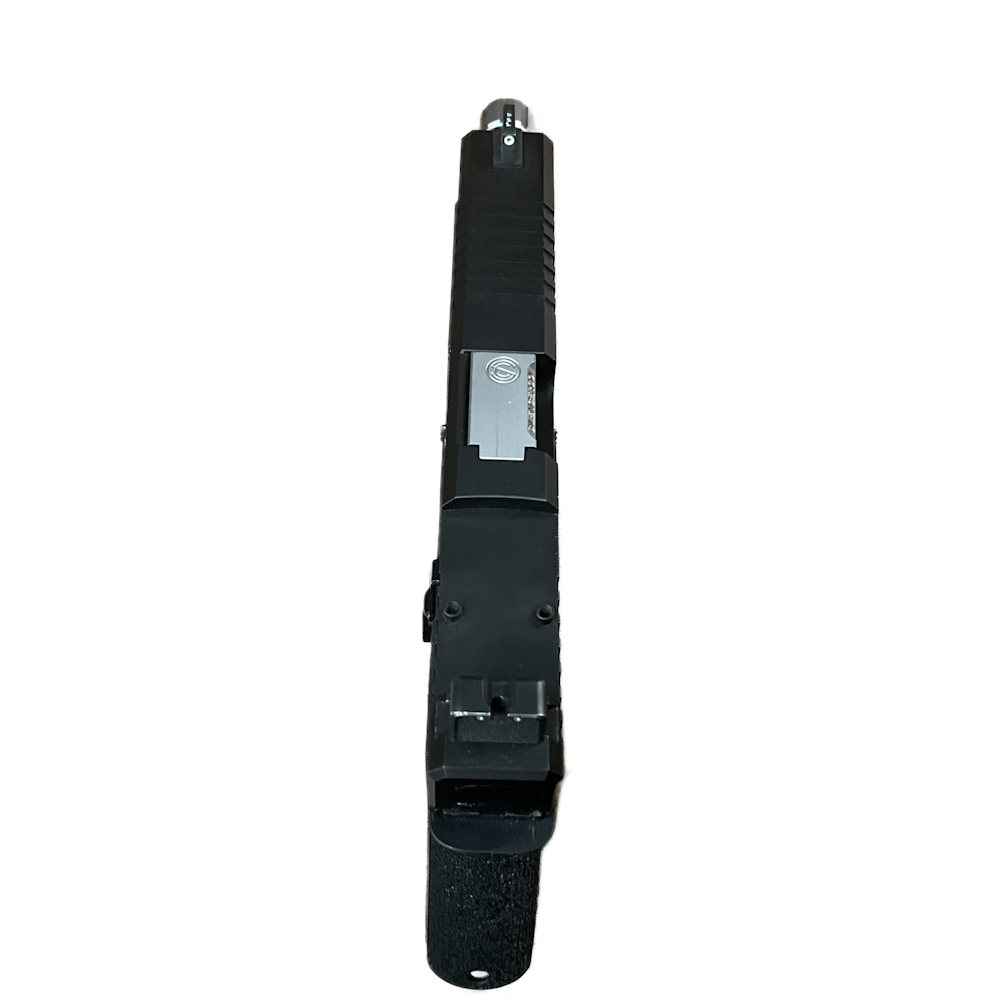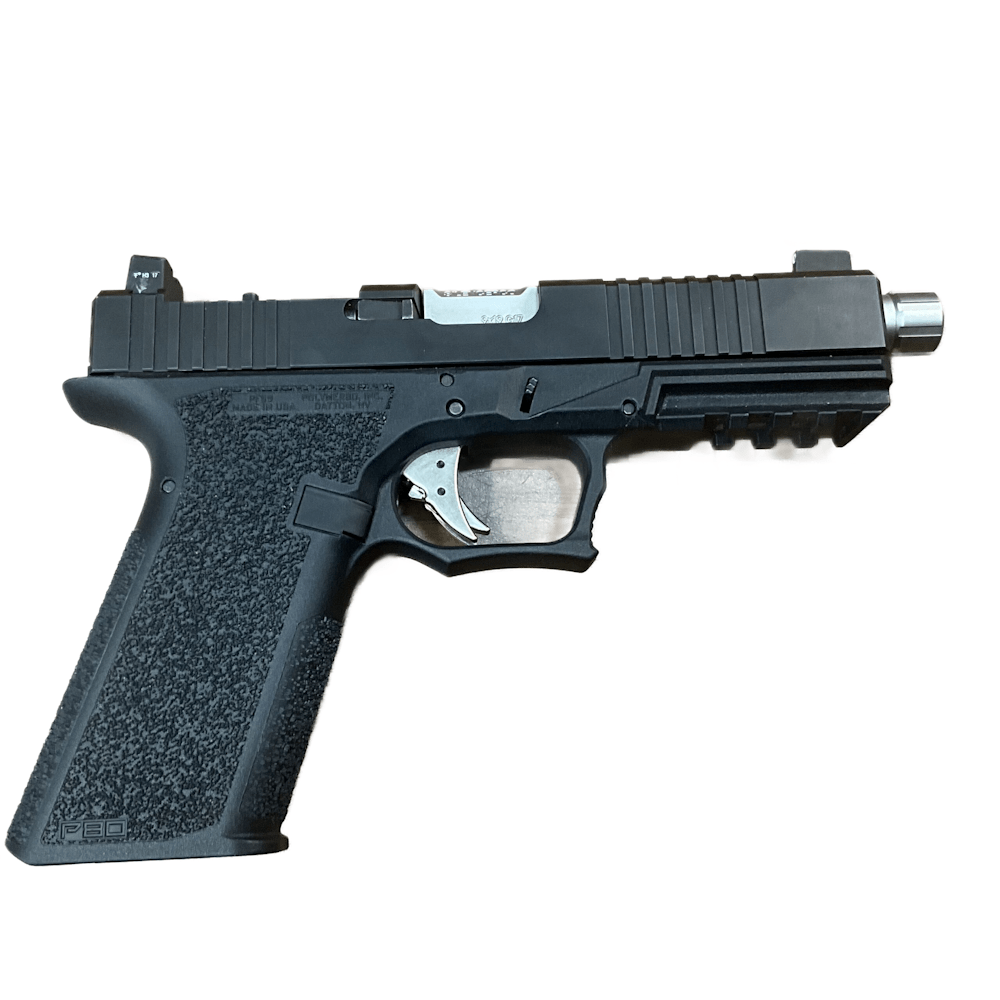 The Polymer 80 PFS9 (Full Size) is a 9mm striker-fired pistol featuring a 4.49″ barrel, 10+1 round capacity, and an overall length of 8.03″. It features an ergonomic, reinforced polymer frame with aggressive texturing, a double-undercut trigger guard, and a 1911 grip angle. The slide is 17-4 PH stainless steel with black nitride finish.