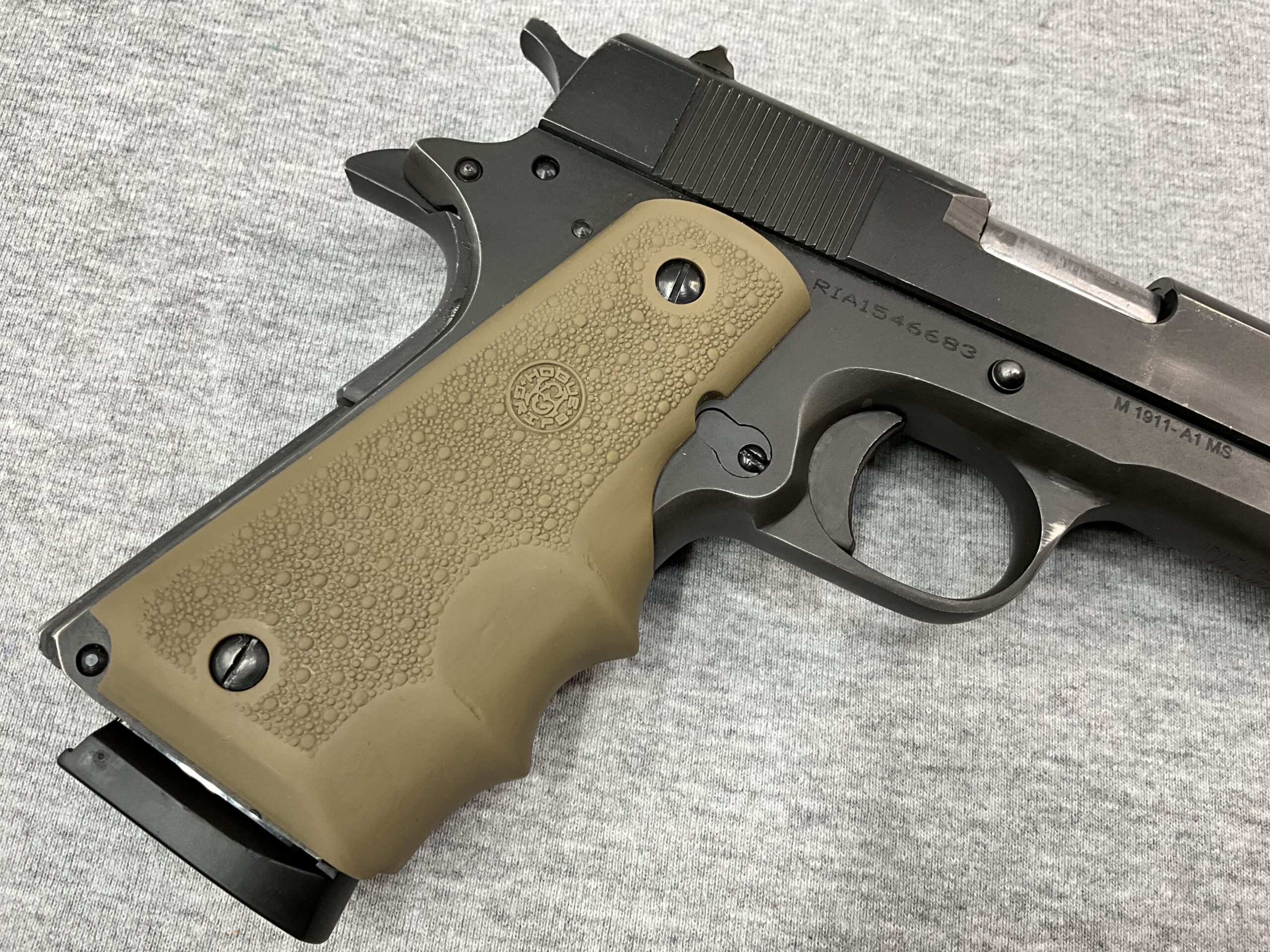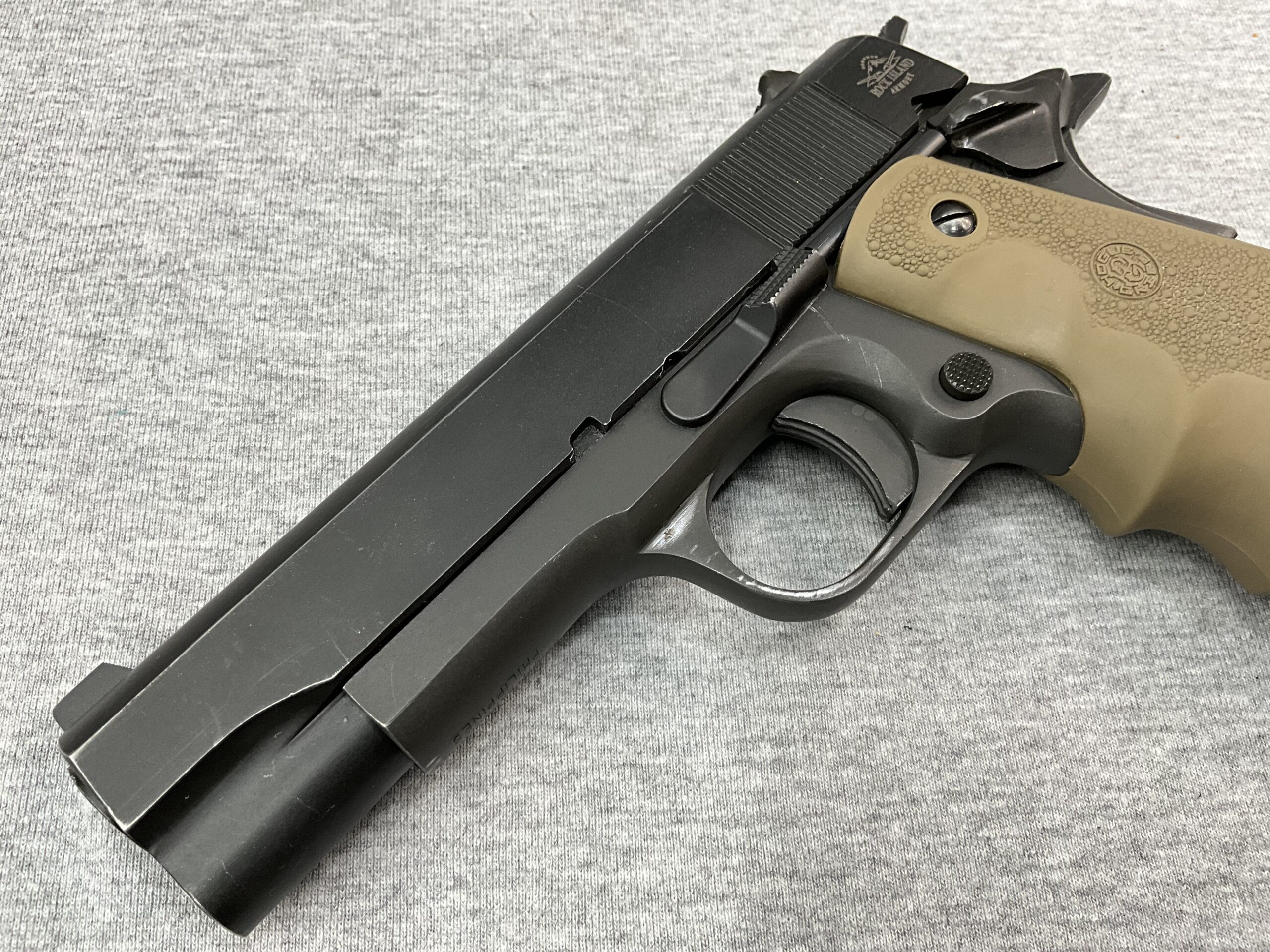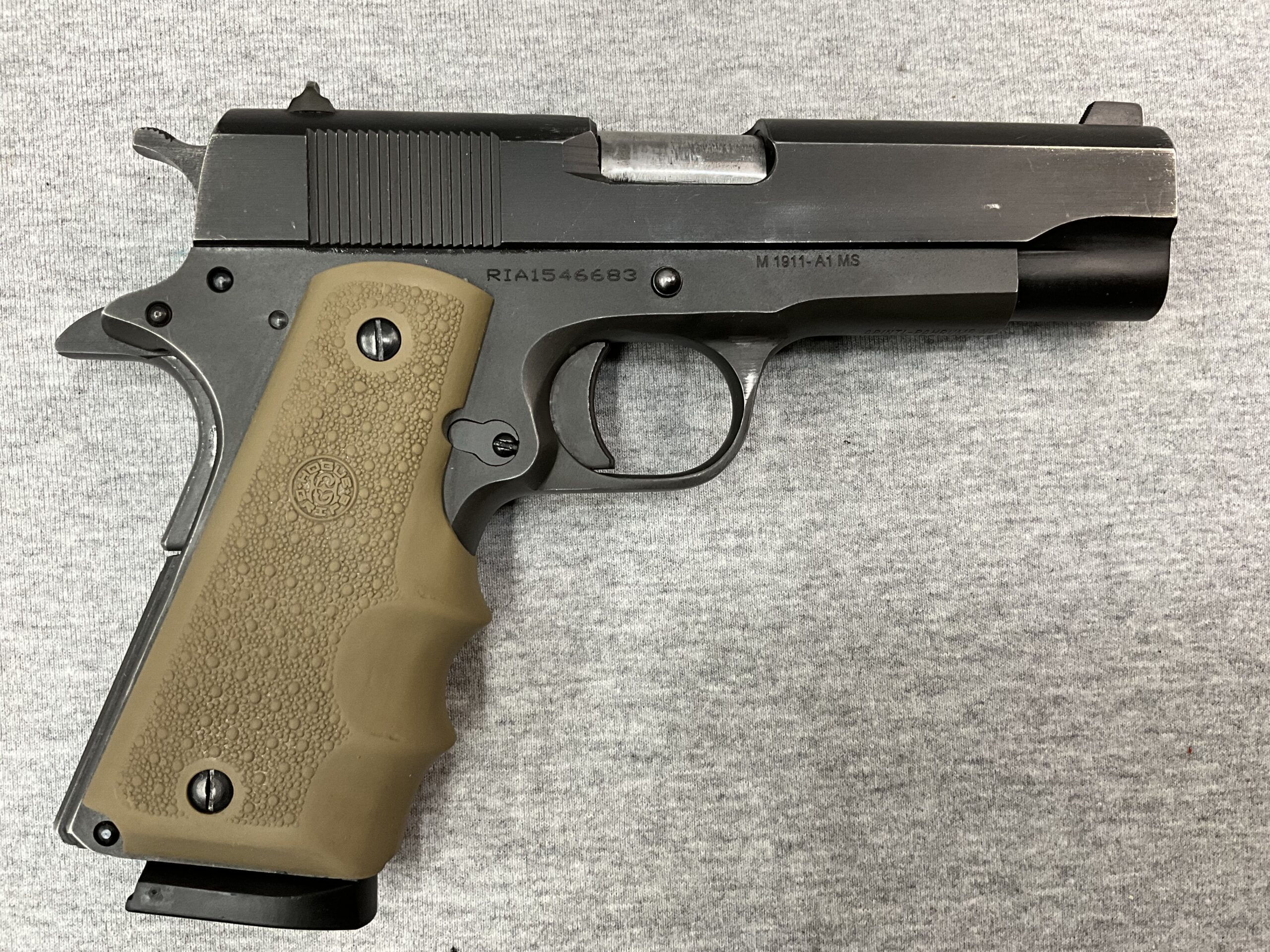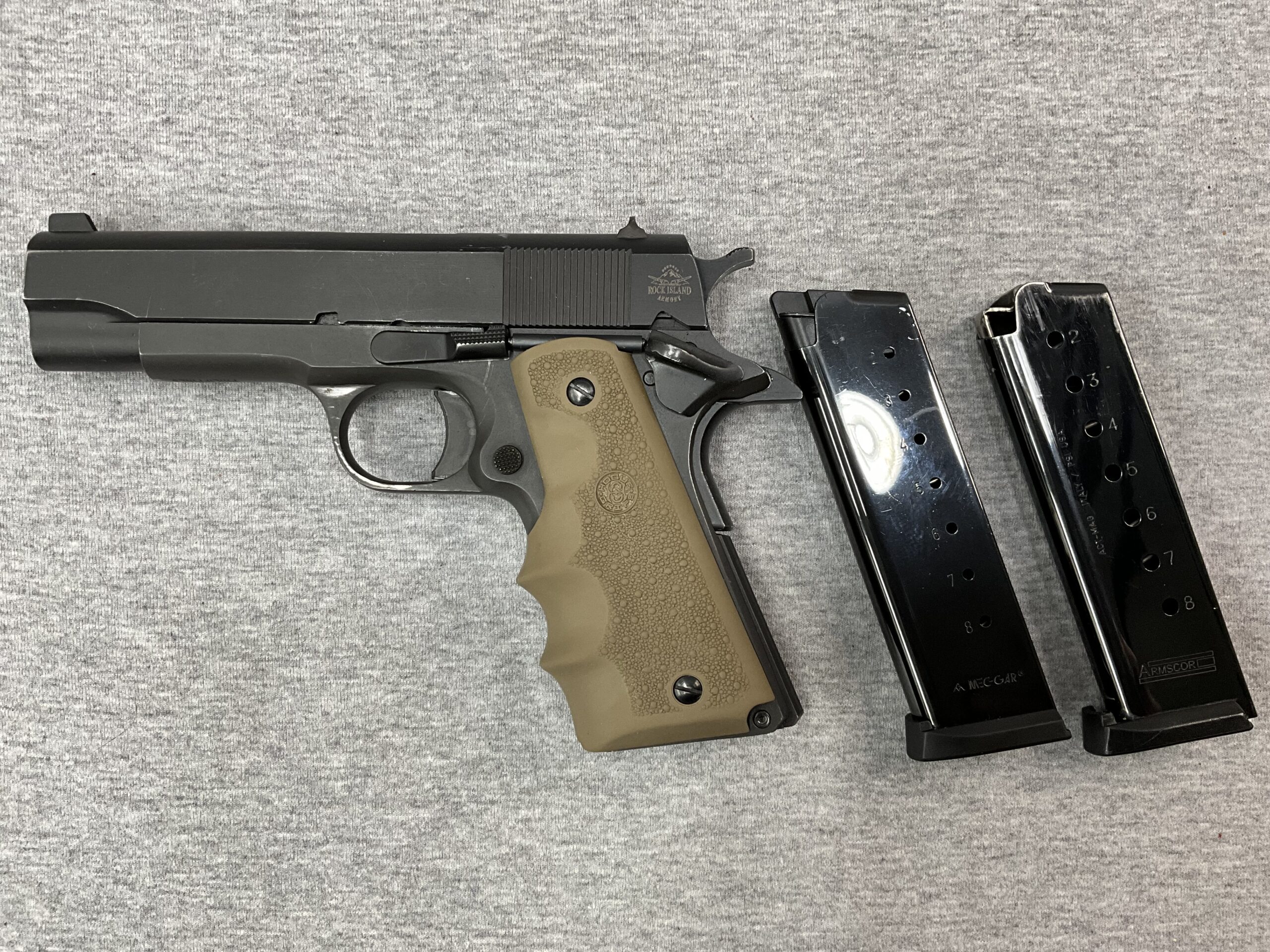 Rock Island M1911 A1 Standard MS 45ACP Pistol Posted: 03/10/2026 Rock Island M1911 A1 Standard MS 45ACP Pistol Caliber: .45ACP 4.3” Barrel Length Black Parkerized Finish Hogue Grips in Tan Two 8 Round Magazines