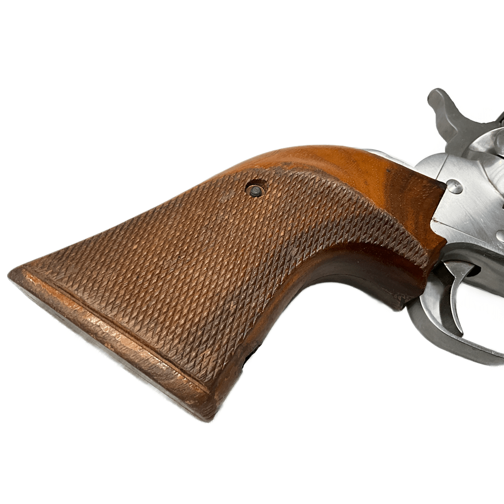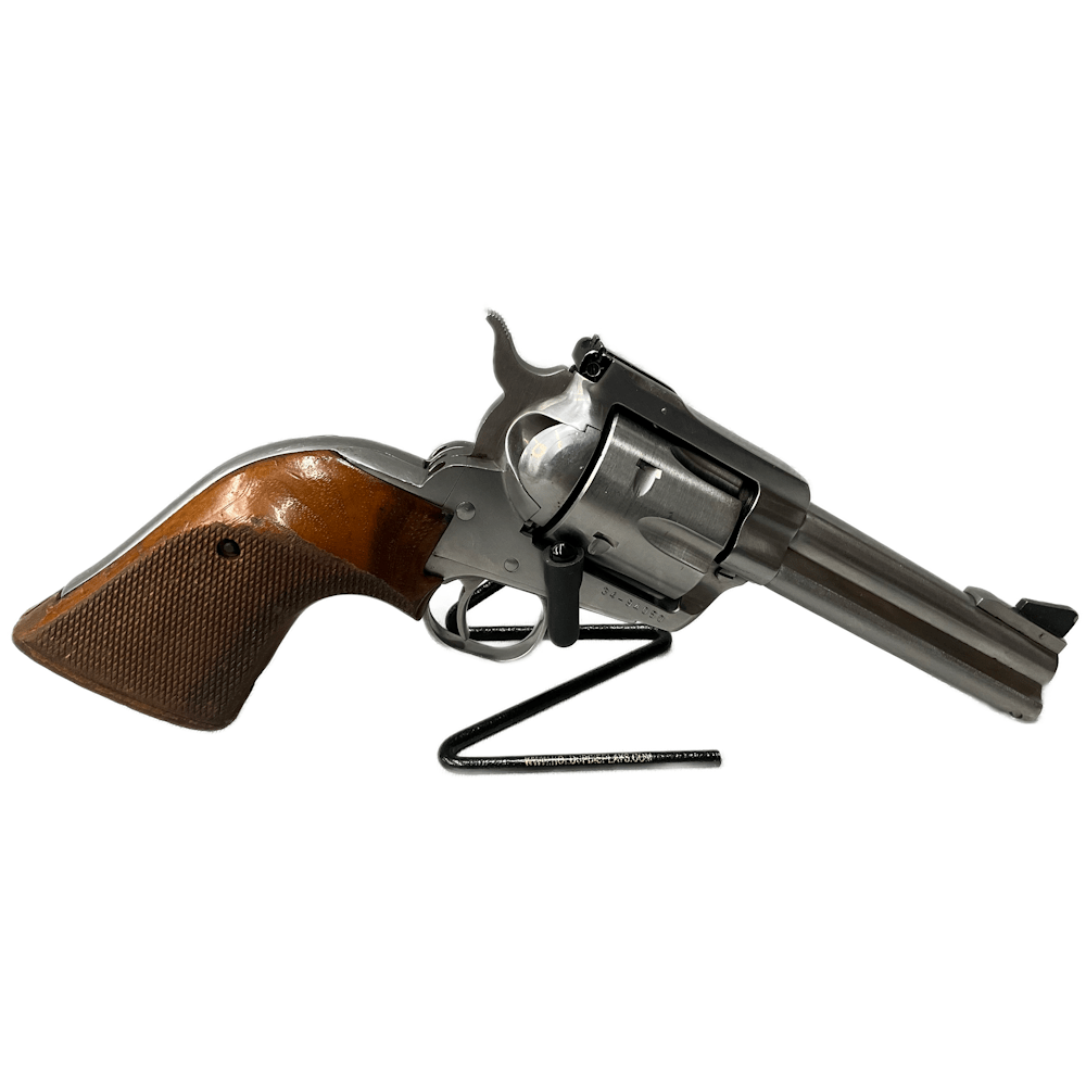 This Ruger New Model Blackhawk Stainless .357 Magnum is a 6-shot single-action revolver with a satin stainless finish, featuring an adjustable rear sight and ramp front sight. Comes with the 4.62′′ barrel, it has a 1:16” RH twist, hardwood grips, and weighs between 46–48 oz.