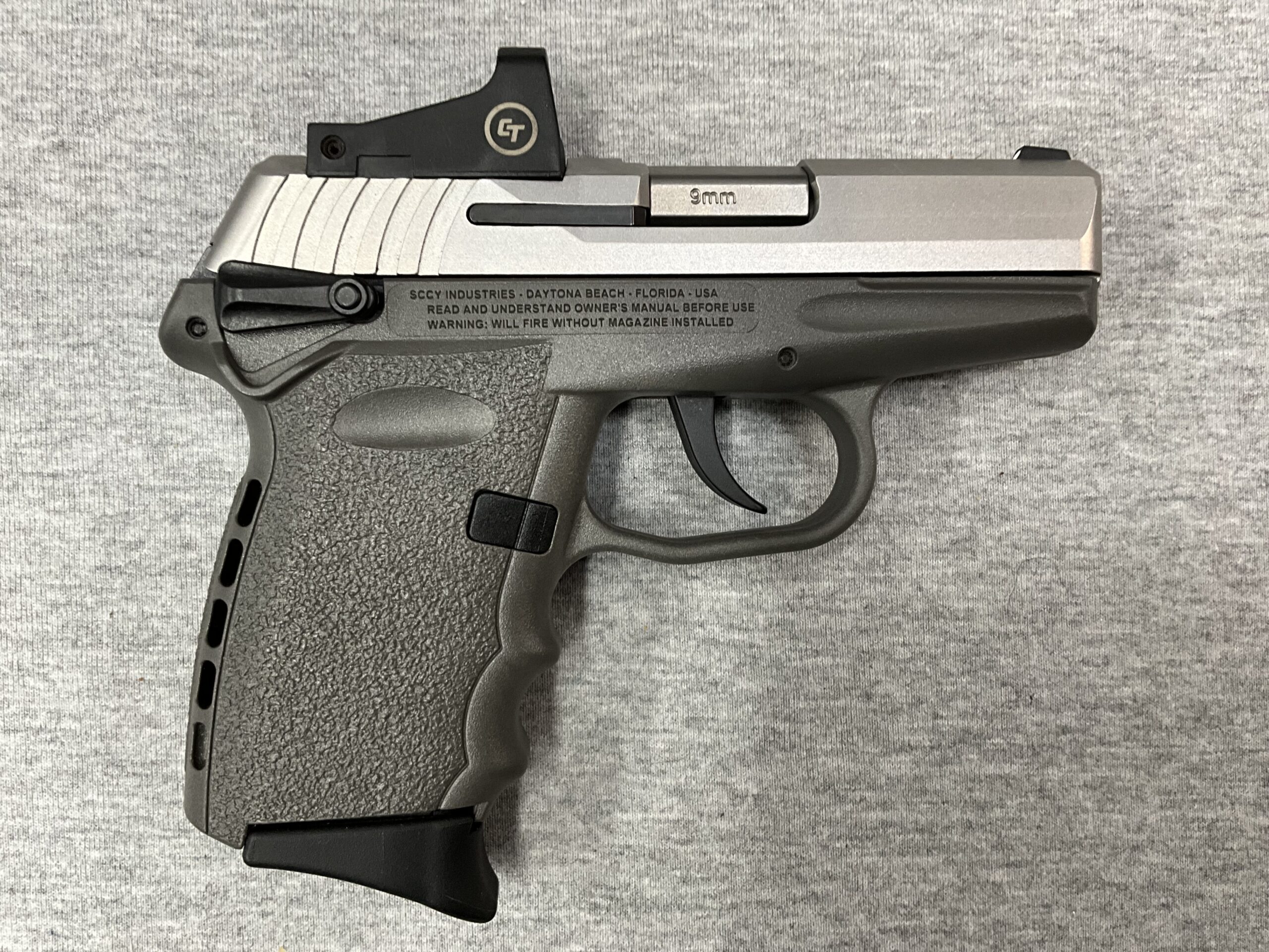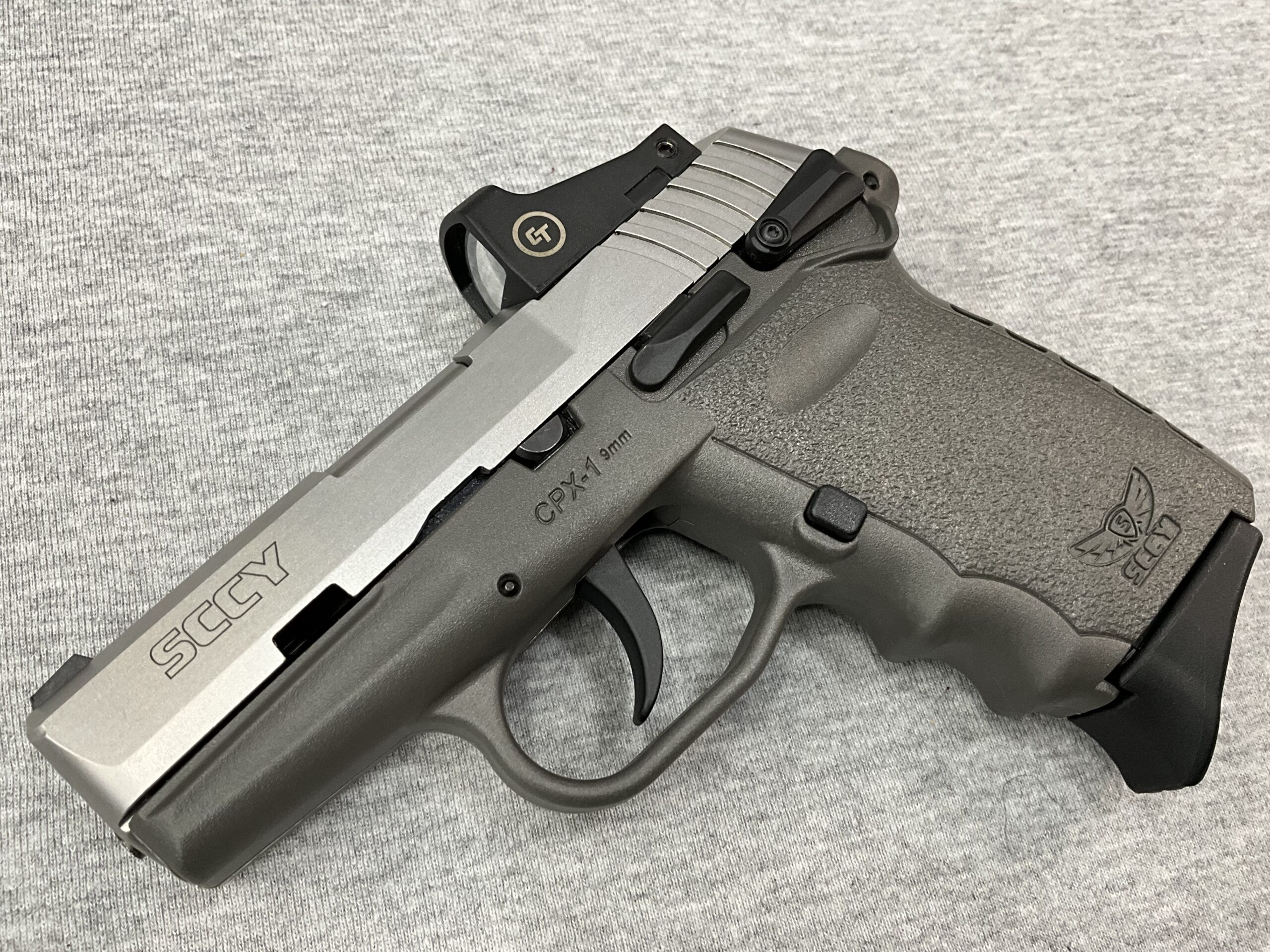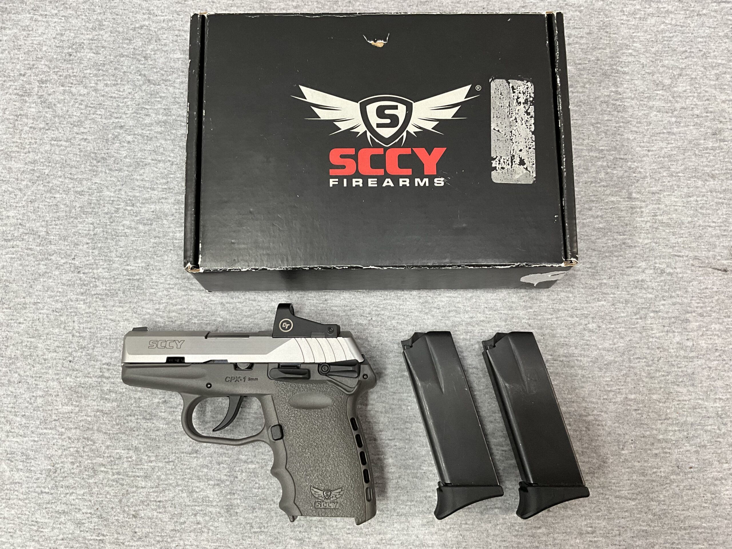 SCCY CPX-1 in Sniper Grey 9MM Pistol with Red Dot Optics Posted: 03/27/2026 SCCY CPX-1 in Sniper Grey 9MM Pistol with Red Dot Optics Caliber: 9MM 3.1” Barrel Length Crimson Trace Red Dot Sight Matte Stainless Steel Slide Sniper Grey Polymer Frame Two Magazines + Original Box