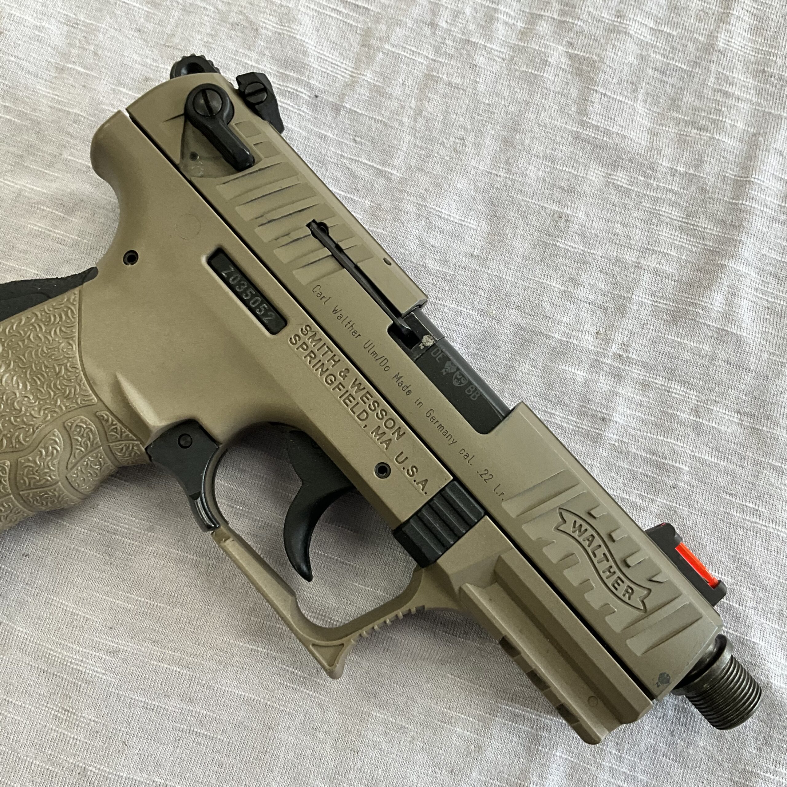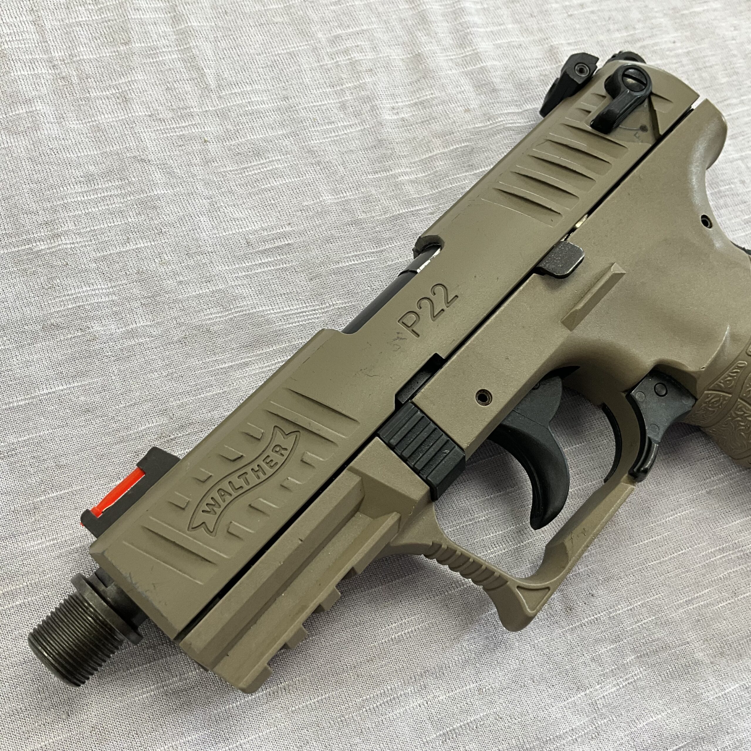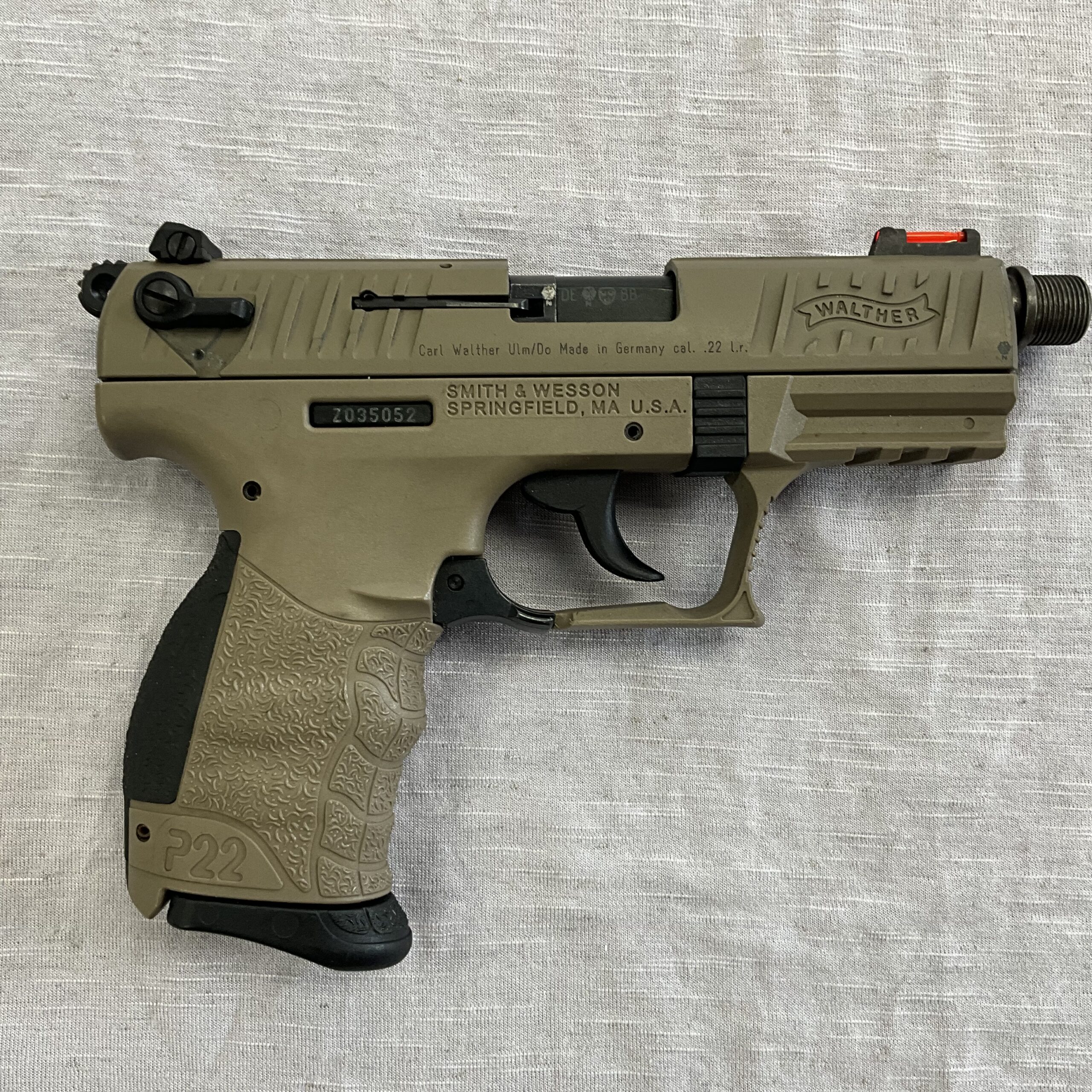 Walther P22 Tactical FDE 22LR Pistol Posted: 04/27/2026 Walther P22 Tactical FDE 22LR Pistol 4” Threaded Barrel Length (Threaded End Cap Missing) Rugged Tactical FDE Finish Two 10 Round Magazines Hi-Vis Front Sight